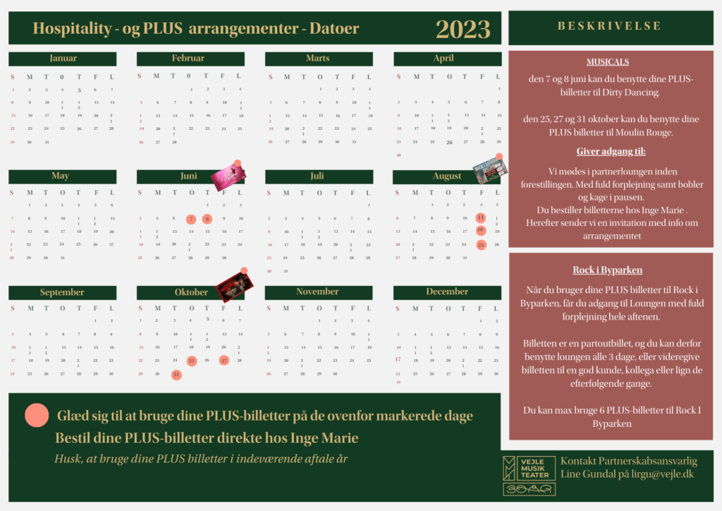 I oversigten herunder kan du se hvilke arrangementer, hvor du kan glæde dig til at bruge dine PLUS-billetter. Du bestiller dine PLUS-billetter direkte hos vores arrangementskoordinator Inge Marie Jørgensen. Du kan bruge PLUS-billetter til udvalgte dage på musicalsne Dirty Dancing og Moulin Rouge. Derudover kan du bruge PLUS-billetter til Rock i Byparken. Datoerne ser du er herunder.